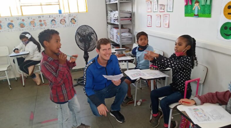 Andrin Pelican (Herby) and children from the city "Vitória da Conquista" in Bahia at Brazilian Schools testing Herby's solution to improve learning in the literacy phase.