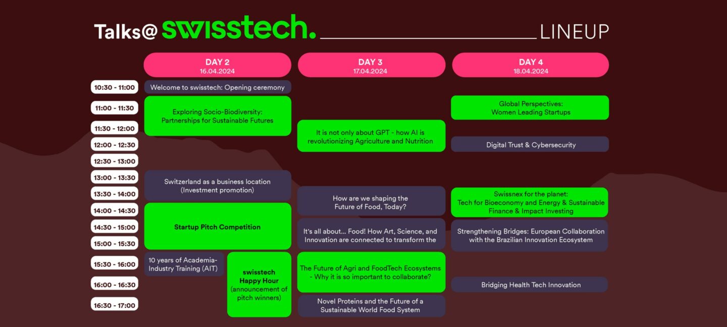 This year, we welcomed 12 Swiss startups at our swisstech pavilion, which radiated to the event hall in its wooden and green structure, hinting towards our focus areas in the future of food, sustainability, and bioeconomy. The dynamic and welcoming atmosphere at our stand contributed to forming connections between our Swiss and Brazilian stakeholders.