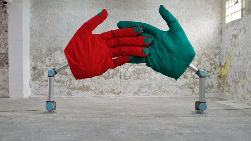 Andrea Anner e Thibault Brevet da AATB, apresentaram projetos desenvolvidos com braços robóticos. A ideia é ampliar os espaços dos robôs para além das indústrias e permitir que eles brinquem e interajam com as pessoas. Um dos projetos, realizado na Swissnex in Boston, permite que duas pessoas controlem braços mecânicos virtualmente para que se toquem no mundo físico, realizando um aperto de mão remoto (Handshake). Em outro projeto um robô cria bolhas de sabão, como crianças, evocando uma atividade lúdica. Confira aqui o portfólio do AATB “Practice for Non-industrial Robotics” (prática para robôs não industriais, em PDF) – AATB-Portfolio-2020-07-LR.