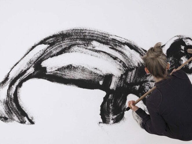 So I drew some extinct animal species with a broom and then wiped them away again. The drawings are in painterly motion and are reminiscent of early cave paintings.