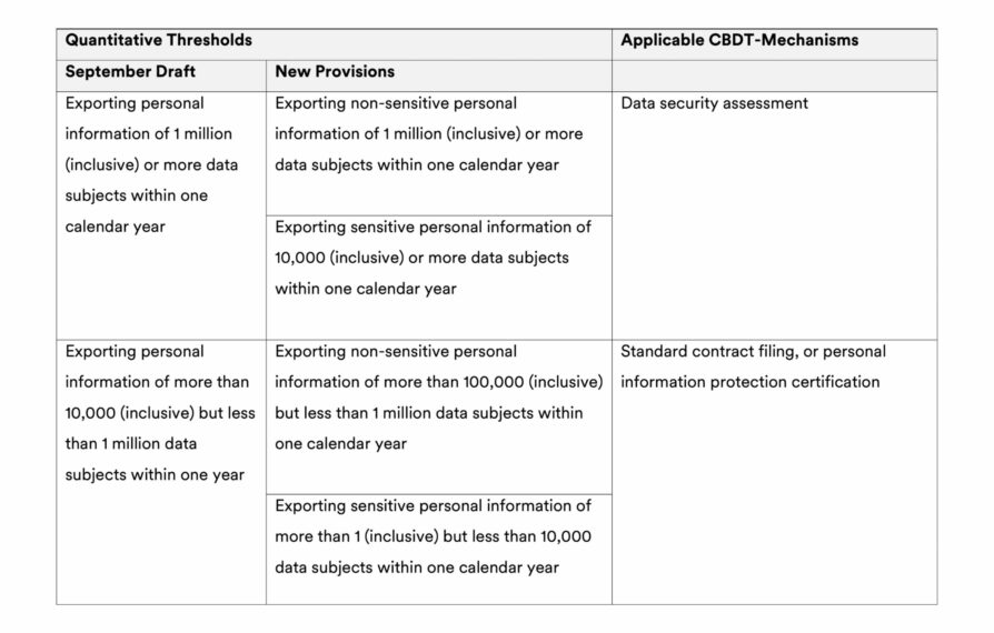 As discussed above, the New provisions often work with thresholds when determining whether data may be freed from the necessity to undergo a CBDT-mechanism prior to its export from China. Besides, these thresholds were fine changed in the New Provisions compared with the 2023 Draft.