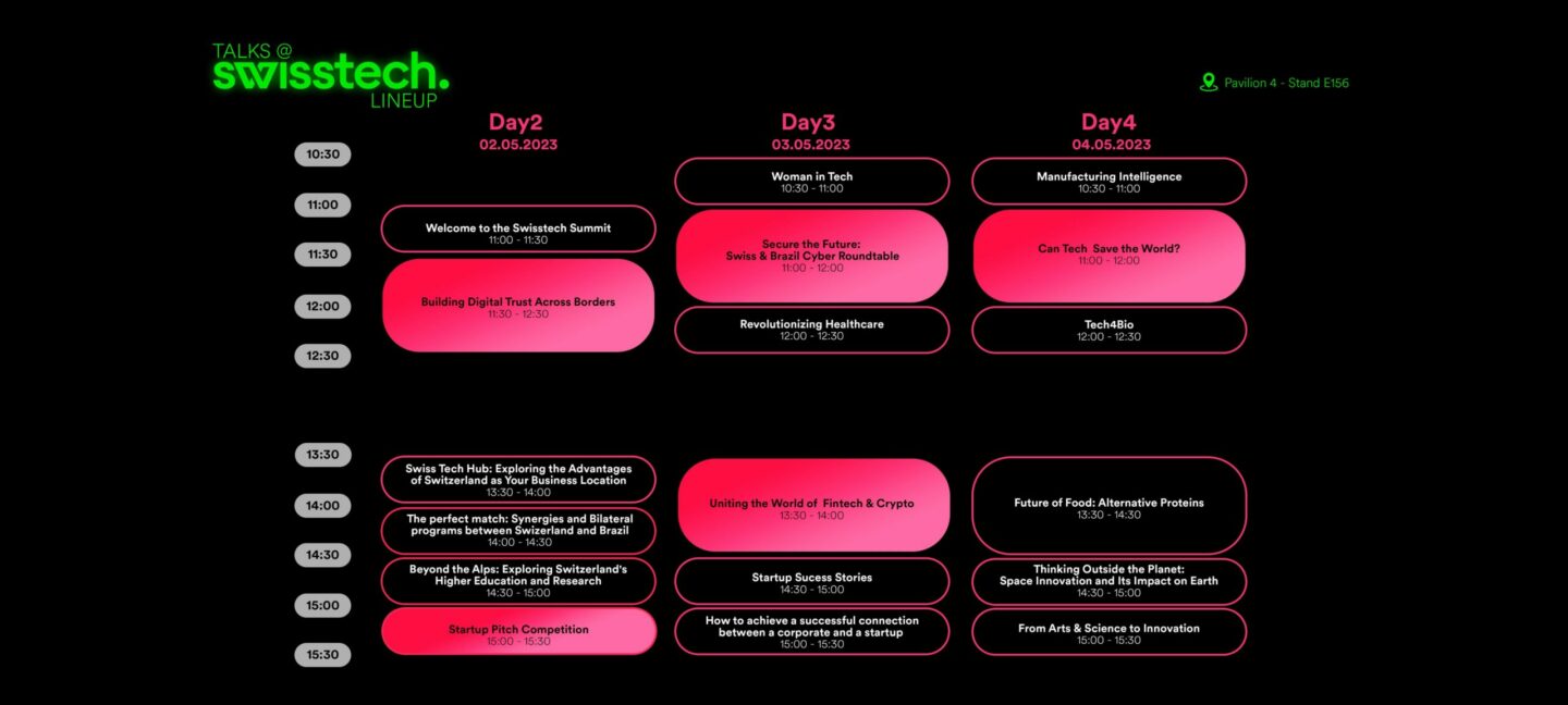 Juntamente com as empresas e startups suíças, a Embaixada da Suíça no Brasil e parceiros locais, a Swissnex posicionará a Suíça em áreas como sustentabilidade, digitalização e excelência tecnológica e acadêmica, além de enfatizar e promover empolgantes (e futuros) projetos e colaborações bilaterais. Mais especificamente, são planejadas sessões com palestrantes qualificados e campanhas individuais: Trust and Cybersecurity, Clean/Green Technologies, Health Technologies, Space Technologies, Higher Education and Research, Future of Food, Bioeconomy, and Race to Net Zero.