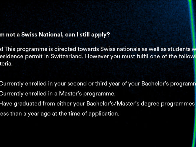 This programme is designed for students enrolled at Swiss Universities of Applied Sciences or Swiss universities (or recent graduates thereof).