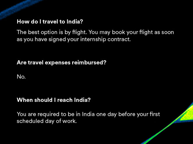 It is a three-month internship where the full calendar months are calculated. Starting dates are generally flexible. The internship is expected to be completed at one go (you cannot split the period). An extension of the internship may be considered based on mutual agreement between you and the company. However, the cost of living will need to be borne by the applicant entirely for any duration extending three months.