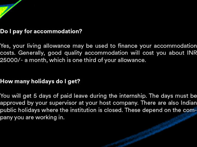 The host company might provide recommendations as to where you could live during your internship. You are encouraged to explore platforms like AirBnB and No Broker.The accommodation costs are to be covered by you from your living allowance.