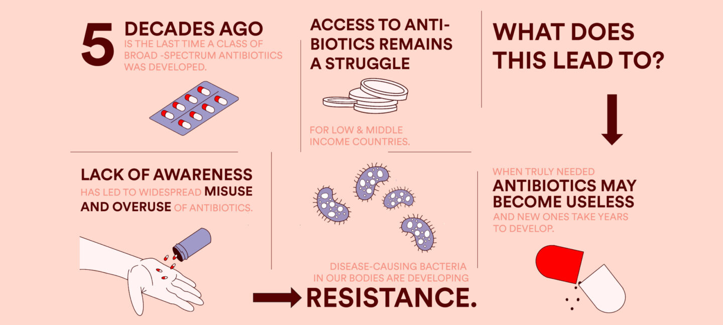 TB is one of the most complex AMR-related challenges, but AMR in general has dangerous implications for human life, including the possibility of death triggered by other bacterial infections. The last time a class of broad-spectrum antibiotics was developed was about five decades ago. Lack of awareness around AMR has prompted people to misuse antibiotics for infections that are not bacterial—particularly viral and fungal. The disease-causing bacteria in our bodies are developing resistance to the antibiotics and very soon we will run out of the strongest antibiotics available. At the same time, low- and middle-income countries struggle to get access to new life-saving antibiotics. This has serious consequences—when we genuinely need antibiotics to deal with medical issues like C-section deliveries, basic surgeries, pneumonia and tuberculosis, the antibiotics will be rendered useless and will not work on killing the disease-causing bacteria. And it takes years of research and trials to develop new antibiotics.