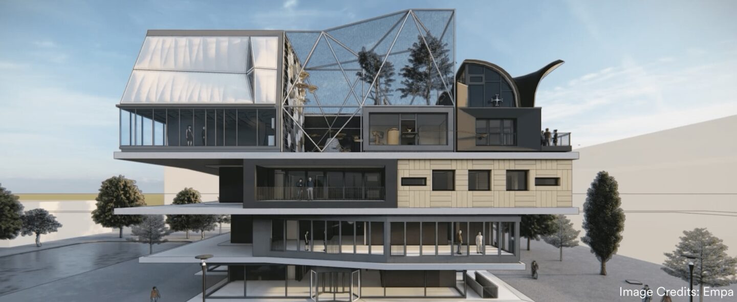 But this is not just a futuristic concept. The idea is grounded in a proven model from Switzerland: the Next Evolution in Sustainable Building Technologies (NEST), the modular research and innovation building at the EMPA-Eawag campus.