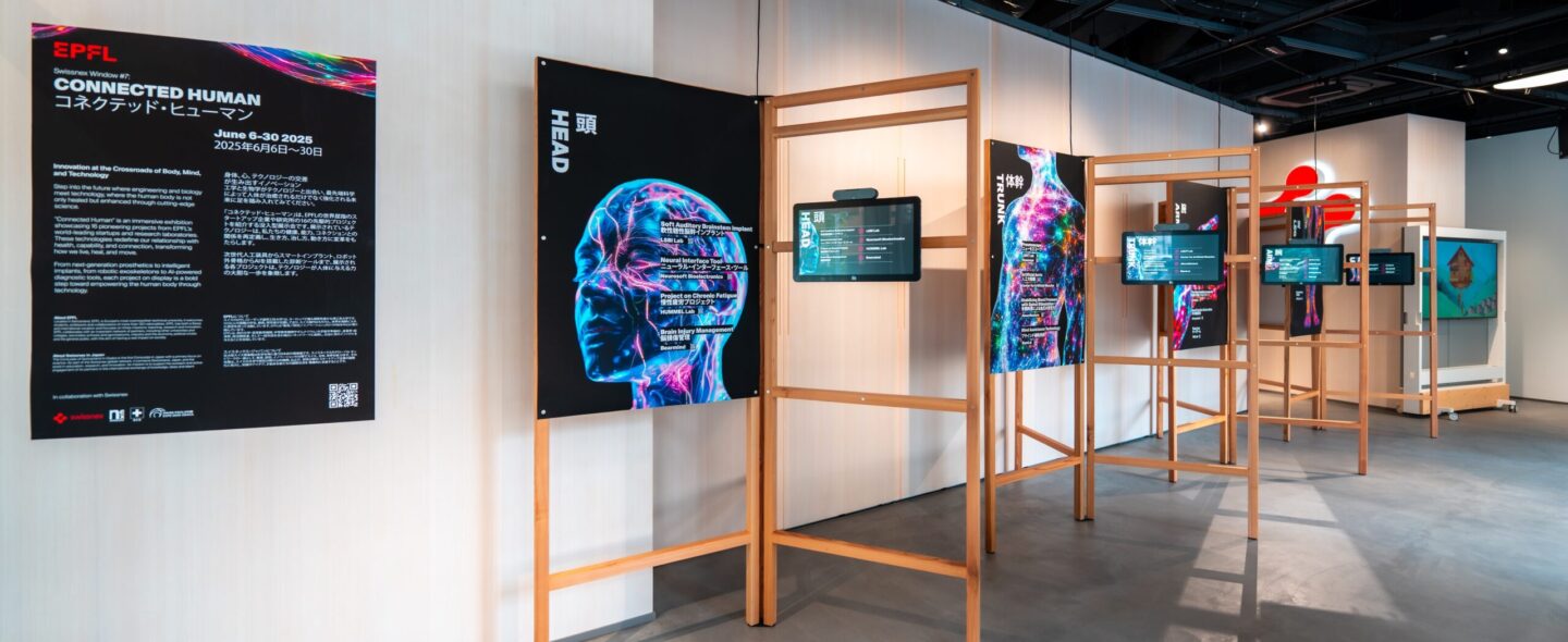 From June 6 to 30, visitors to Swissnex in Japan’s public window space experienced an interactive exhibition featuring 16 pioneering research projects from EPFL (École polytechnique fédérale de Lausanne). Designed to provoke reflection and connection, the Connected Human exhibition explored how technologies such as exoskeletons, AI-powered diagnostic tools, and bioelectronic implants are not only augmenting human capabilities but also enabling repair and reconnection in radically new ways.
