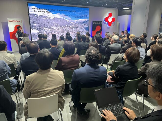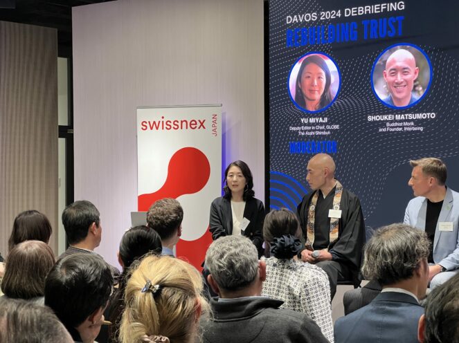 Full house Insights to Megatrends & Solutions! – Swissnex in Japan, in collaboration with Swiss Business Hub Japan, hosted the Davos Debriefing under the theme "Rebuilding Trust," reflecting the Annual Meeting 2024's focus. Kiriko Honda, Interim Chief Representative Officer, Japan, World Economic Forum set the tone by presenting a brief history of the WEF and an overview of the Annual Meeting in Davos 2024, where different challenges faced by the world were addressed, such as AI – as the biggest topic – a driving force for the economy and society as well as long-term strategy for climate, nature and energy – climate crisis was at the center. Those challenges impacted most of the discussions during the more than 450 sessions at the WEF in Davos, with 3,000 leaders from government, business, and civil society from more than 125 countries. Following a panel discussion, the debriefing event concluded with an engaging Q&A session. The wonderful audience thoroughly engaged with the panelists, asking thought-provoking and in-depth questions. Our greatest appreciation goes to: Kiriko Honda, Interim Chief Representative Officer, Japan, World Economic Forum; Shinsaku Toyoshima, News Presenter / TV Tokyo News Division; Yu Miyaji, Deputy Editor in Chief, GLOBE, The Asahi Shimbun; Shoukei Matsumoto, Buddhist Monk and Founder, Interbeing; Tomoya Nakamura, General Manager, TBM Co., Ltd.; Christian Schmitz, Founder, PDIE Group. (Bios available at the bottom of page) The Consulate of Switzerland, Swissnex in Japan organized this debriefing event in collaboration with Swiss Business Hub Japan and in partnership with PDIE Group, TBM Co., Ltd., Interbeing, Suntory Holdings Limited, Swiss Chamber of Commerce and Industry in Japan (SCCIJ) and Vitality.Swiss. The World Economic Forum is an independent international organization committed to improving the state of the world by engaging business, political, academic and other leaders of society to shape global, regional and industry agendas. Incorporated as a foundation in 1971, and headquartered in Geneva, Switzerland, the World Economic Forum is not-for-profit. More >> www.weforum.org