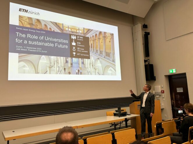 Dr. Christian Schaffner, Executive Director of the Energy Science Center at ETH Zurich, emphasized the many common challenges faced by Japan and Switzerland in ensuring a secure and sustainable energy supply for the future: topics like acceptance of new energy infrastructure, the electrification of the transport and heating sectors, dependencies on fossil energy imports, energy grids among others were discussed. Collaborations at an industrial, governmental and academic level will be crucial.