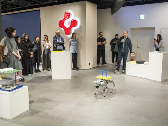 • GO2+ presence immediately caught the attention of visitors with its playful and uncanny presence. This project reappropriates a robot dog, transforming it into a modular robotic furniture system. By extending and modifying the machine, the designers invite a rethinking of product design as a living, responsive entity. The dog-like movement of the robot sparked curiosity and amusement, prompting reflections on human–nonhuman coexistence and how robotics might merge with everyday environments in the near future.