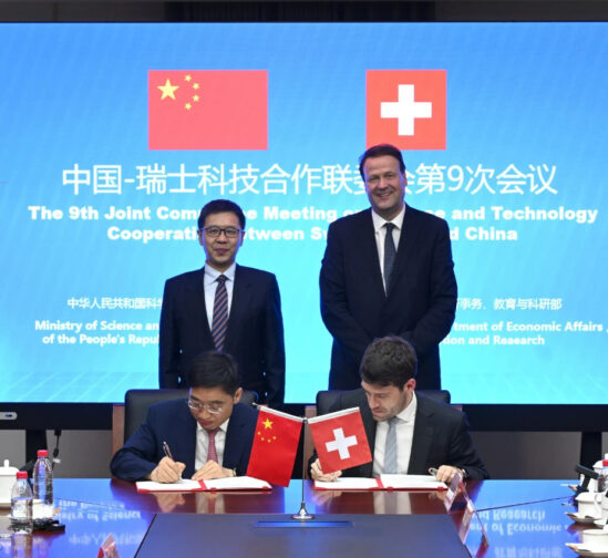 Gang Dai MoST Director General, Department of International Collaboration, Ambassador Jacques Ducrest, the Head of the International Relations Division at the State Secretariat for Education, Research and Innovation SERI, Xiang Gao, Director General, CSTEC, and Philippe Roesle CEO and Consul at Swissnex in China