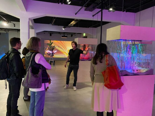 Afterward, the delegation followed to the Critical Media lab for a presentation where they saw unique projects linked to Swissnex’s international network due to the connection made that day. The HEK welcomed the group with a tour of their exhibition “Earthbound – dialogue with Nature,” where it was observed how new technologies are used as a medium to showcase different observations of nature and open further discussions.
