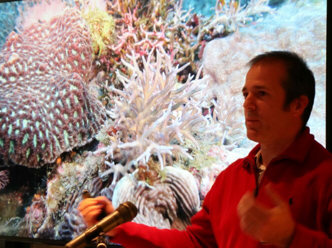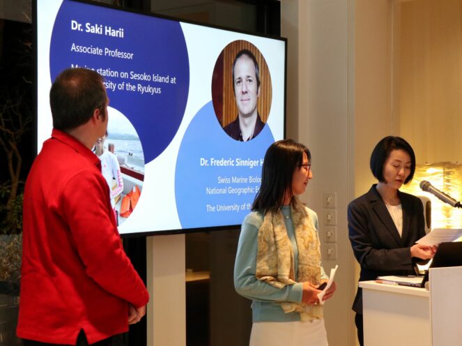 The participants were then invited to take a deep dive into the ocean waters of Okinawa where Dr. Saki Harii and her team including the Swiss biologist and alumnus of the University of Geneva, Dr. Frederic Sinniger Harii, carry their research. Together, at the Tropical Biosphere Research Center at Ryukyus University, they study different facets of coral reef biology, from reproduction, conservation, discovery of new species populating the deep parts of coral reefs, from 30–100 meters and overlaps of species in shallow and deep waters. The insightful presentation included the purpose and history of their research and long-lasting collaboration. Beautiful and colorful pictures of corals taken during their research expeditions were on display during the evening for all to marvel.