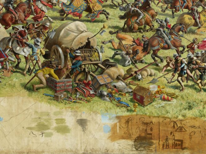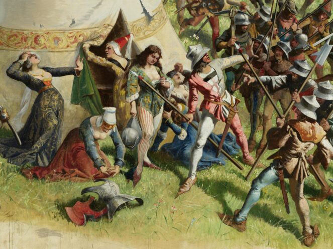 The masterpiece in question is Louis Braun’s monumental 1893 panorama painting depicting the pivotal moment when Swiss Confederates gained the upper hand against the Duchy of Burgundy during its 1476 invasion, a turning point in European history. This extraordinary work, measuring 10 x 100 meters, was commissioned by a Swiss society specialized in public entertainment and served as the main media of the late 19th century. After being displayed in Zurich and Geneva (1894-1907), the panorama fell into obscurity with the rise of cinema, only to be rediscovered in 1996 and briefly exhibited during Expo.02 in a Jean Nouvel-designed monolith on Lake Murten before being stored away again.